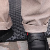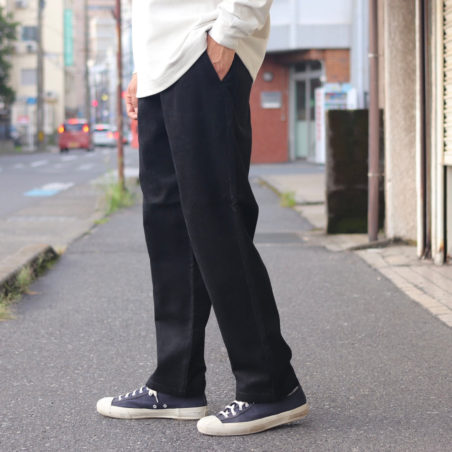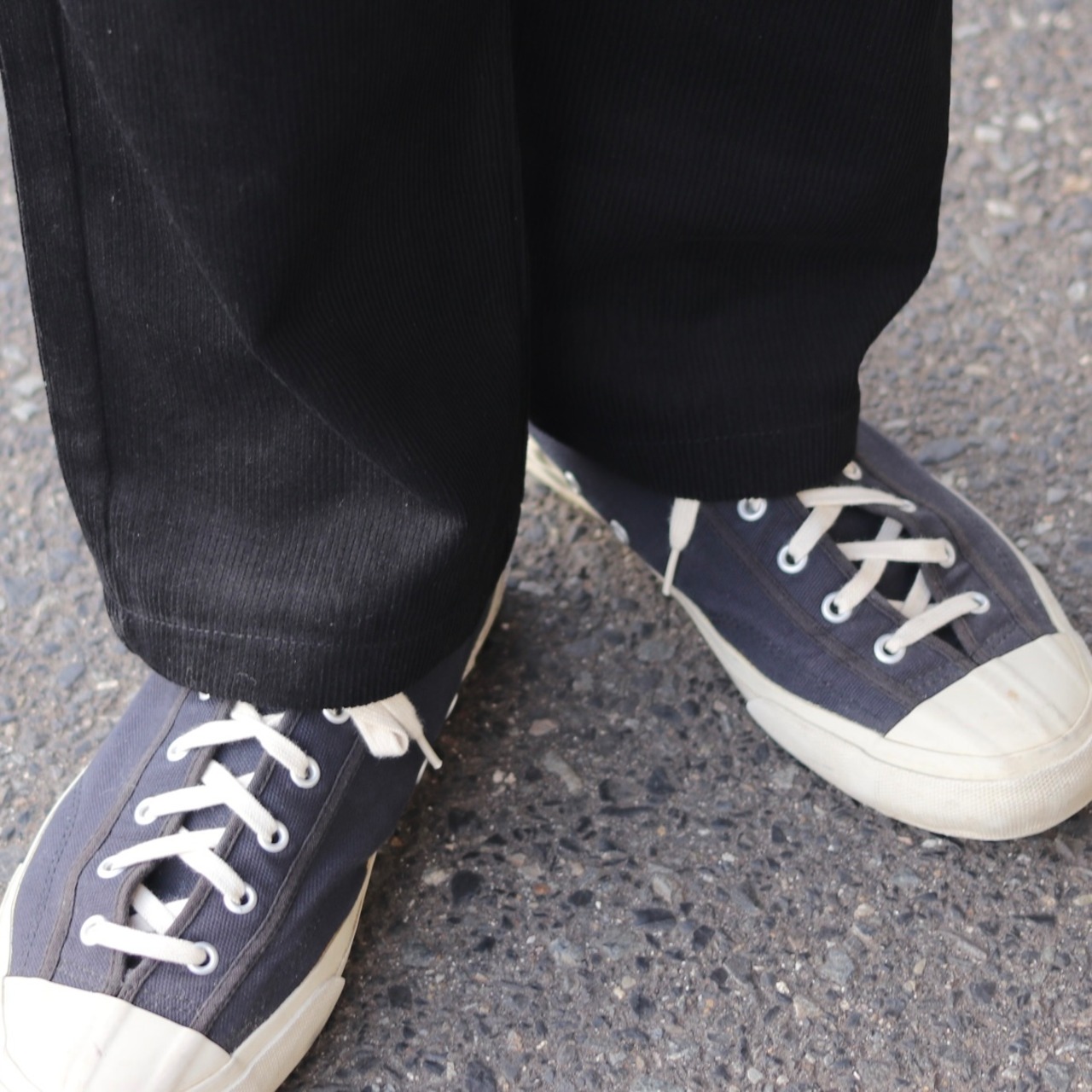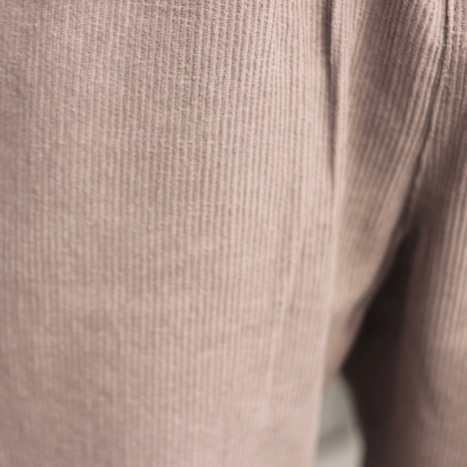 cotton100%の落ち着いた雰囲気のコーデュロイパンツです。細畝で表面は滑らか。微光沢がありとても上品で落ち着いて見えます。