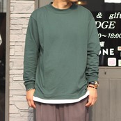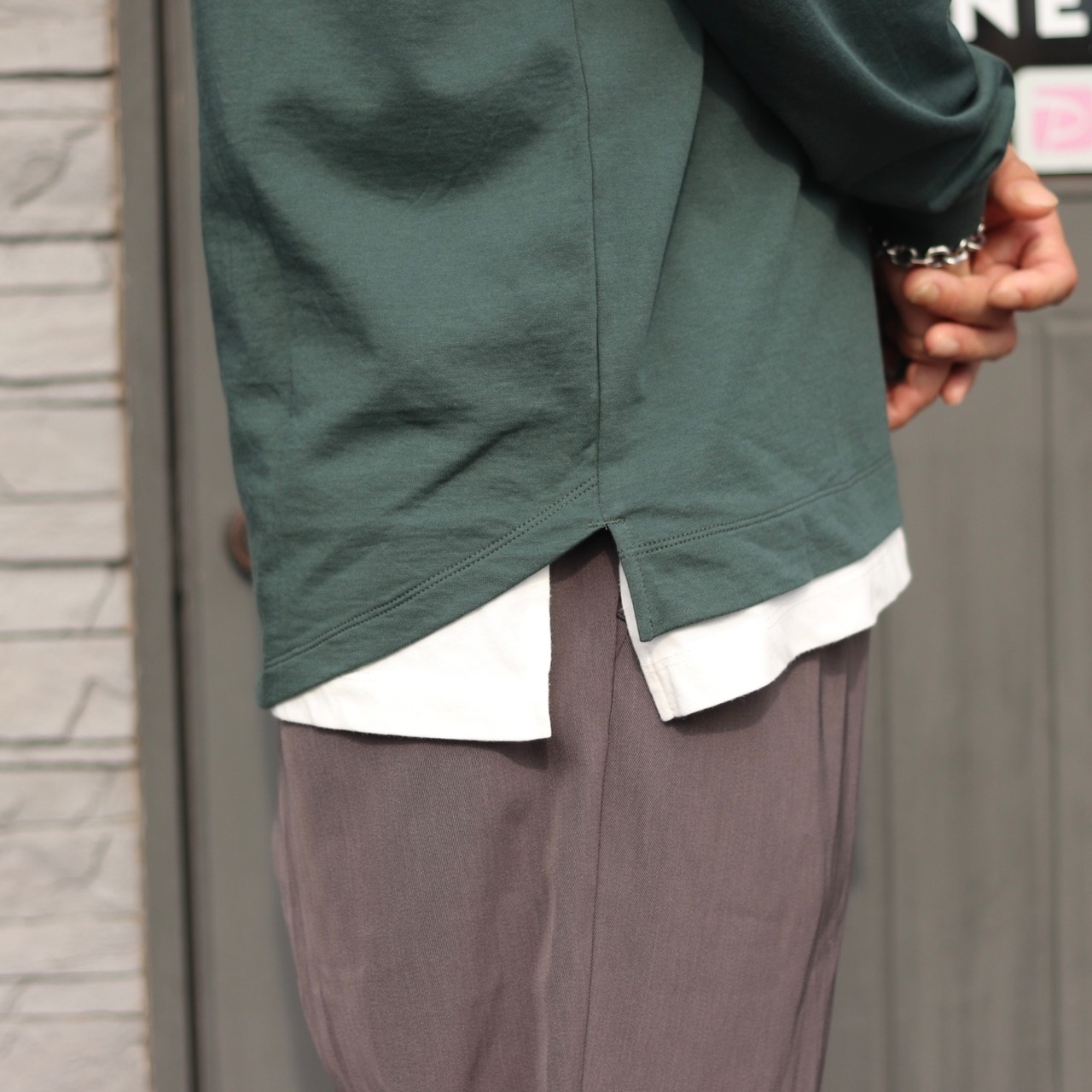 コットンミニ裏毛を用いたハイクルーネックのロングスリーブTシャツ。希少性の高い36ゲージのハイゲージで編み立てながらも、薄くプレーンにならないよう仕上げ加工を工夫し、柔らかさと膨らみを持たせることで、エレガントでありかつカジュアルな素材感になりました。どんなコーディネートにも馴染み、天竺のTシャツよりも厚くスウェットよりも薄い着用期間も長いアイテム。一般的なクルーネックよりもリブ幅を若干高くしたハイクルーのデザイン。