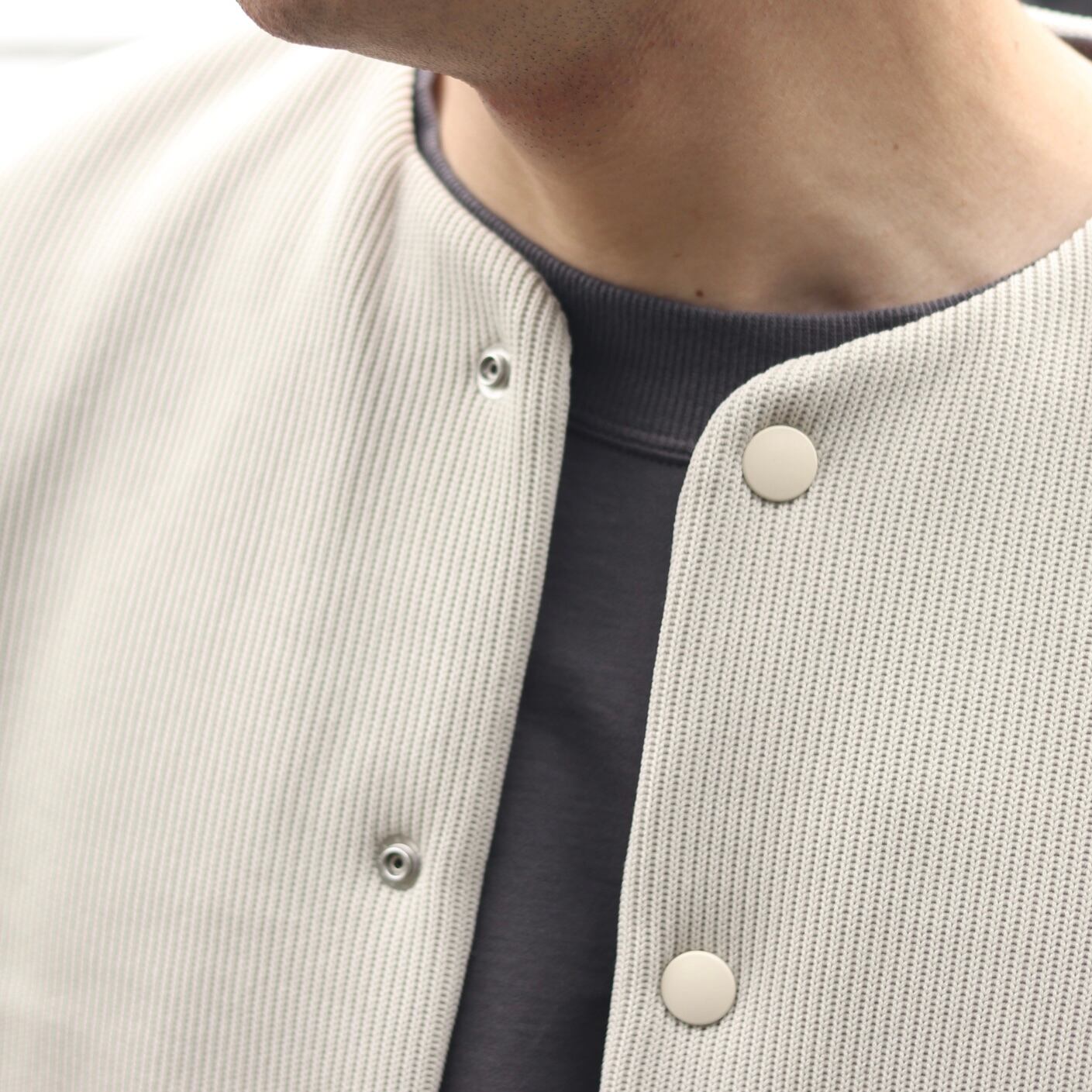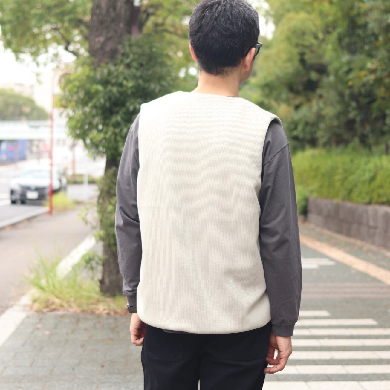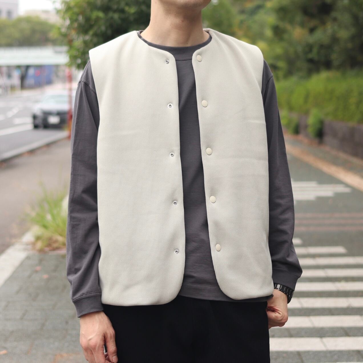 表と裏の見え方が異なるクウォーターゲージニットを用いた薄めの中綿入りベスト。特殊ポリエステルを使用しているため、キックバック性があり糸が膨らむので、表からの見え方に対してかなり軽量に仕上がっています。形はシンプルなノーカラースナップボタンベスト。気温によってミドラー使いもアウター使いもできる様に綿の分量やシルエットのバランスに拘りました。シンプルながらもニット見えする存在感もあるので、コーディネートのプラスアルファとして重宝するアイテムです。ウエスト部分にはシームポケット有り。