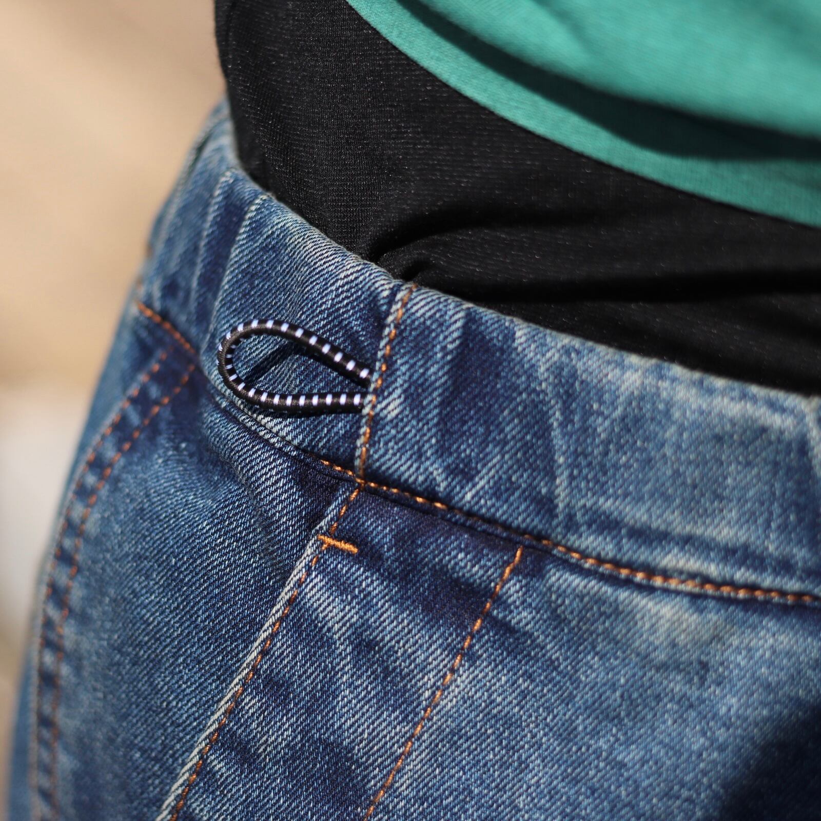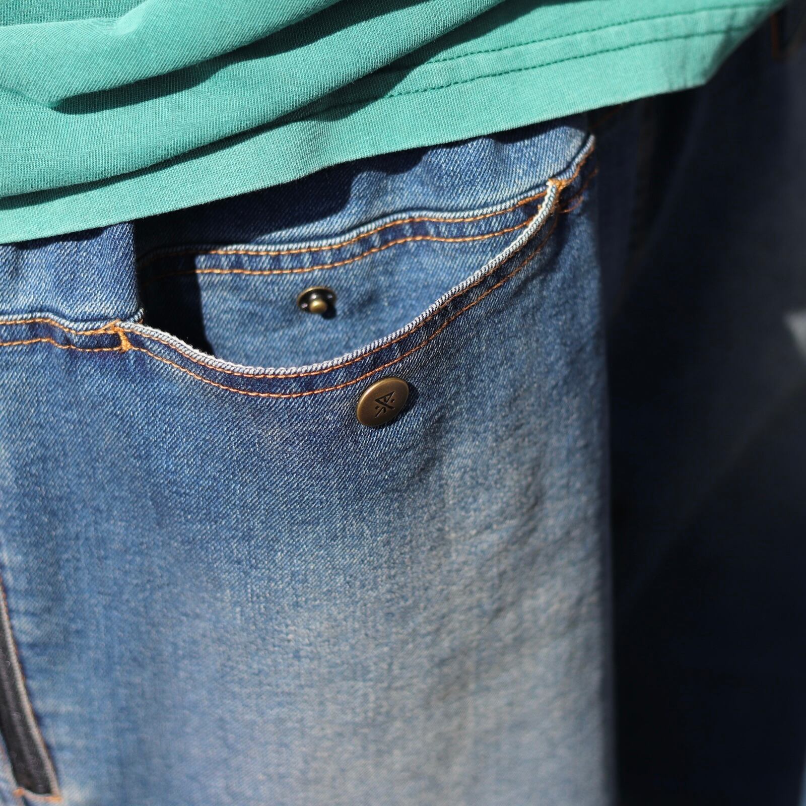 ストレッチ性のあるデニム生地を採用し、エイジング加工で膝や後部に色落ちを再現。