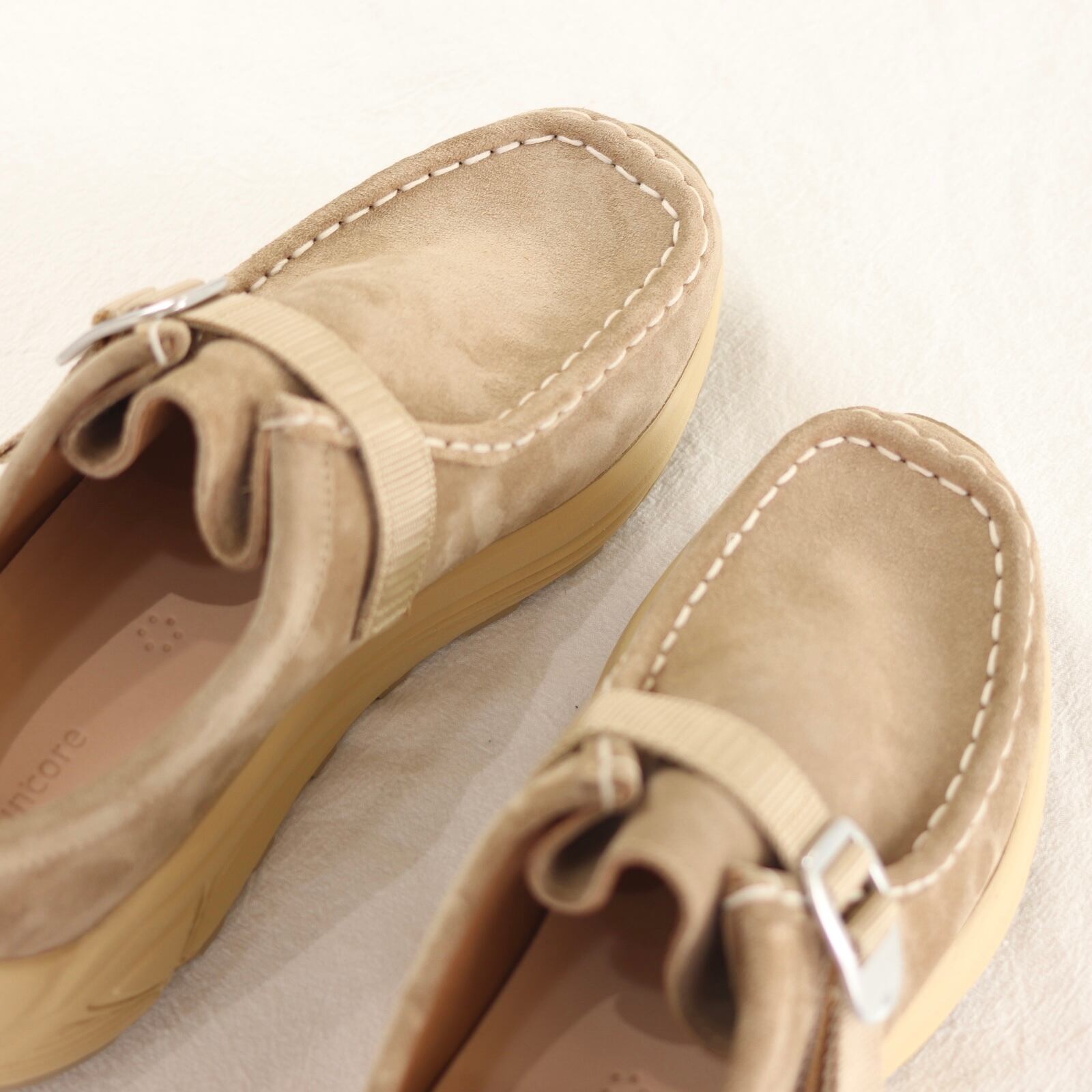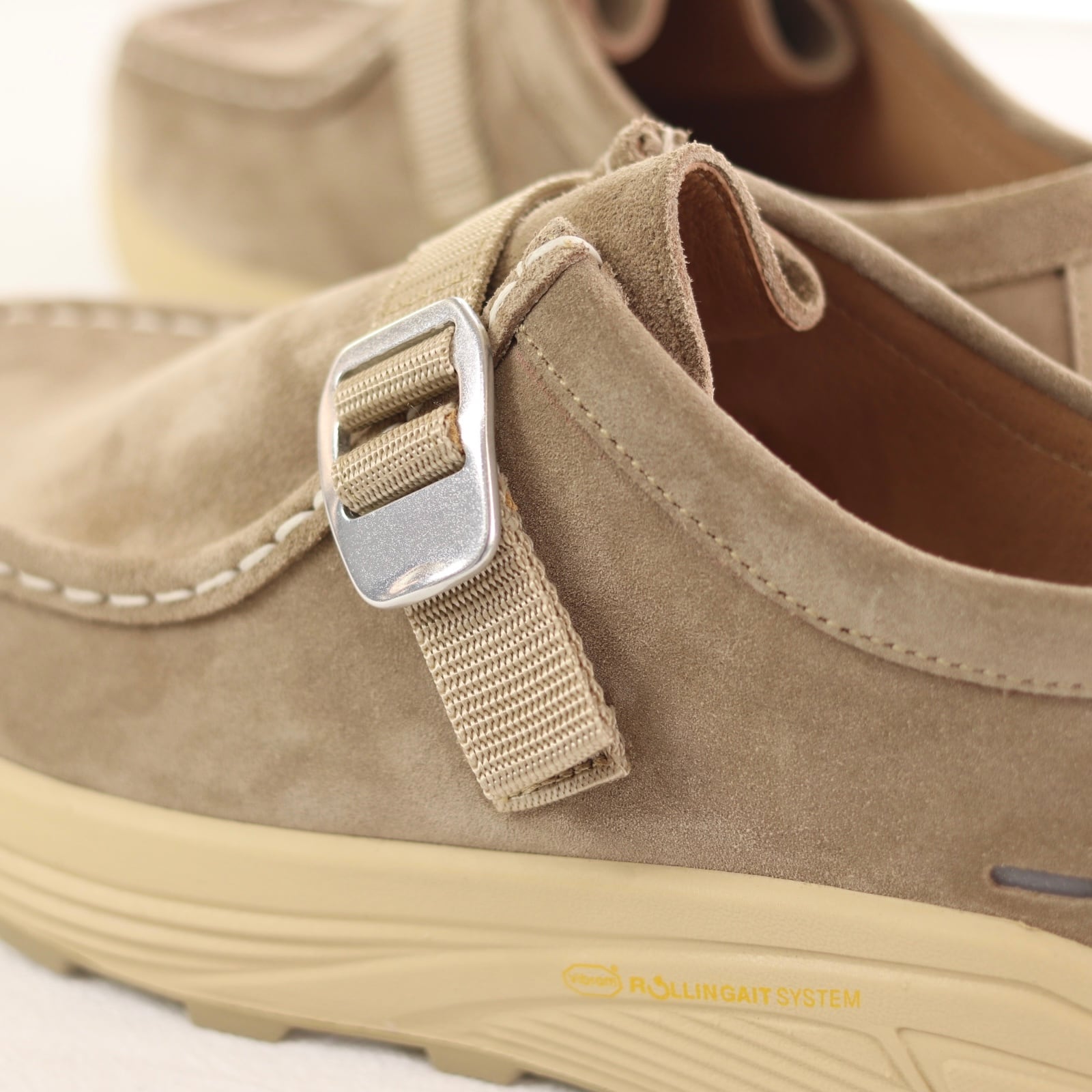 定番チロリアンシューズにvibram ROLLIGAIT SYSTEM SOLEを装着。軽くて丈夫なTRIMMERS (トリマーズ) アルミバックルでベルト仕様のミニマルなデザインにモディファイド。アッパーはWATER PROOF LEATHERを用い、耐水性も兼ね備えたチロリアンスニーカーです。