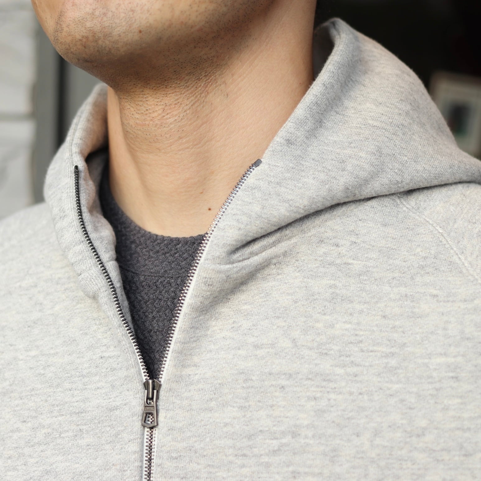 毎シーズンマイナーチェンジを繰り返しながらリリースしているジップアップフーディー。胸周りには適度な分量を持たせつつも裾へとゆるやかにテーパードをかけ、すっきりとした印象のシルエットに。ファスナーを閉めた時はもちろん、開けて着用した時の見え方も綺麗になるようにパターンと仕様を工夫。ファスナーには細さとスライダーの形状にこだわり作成した別注のYKK社製 EXCELLAを使用。EXCELLAは金属1つ1つに丹念に磨きをかけているため、滑りがよく美しい光沢が特徴です。